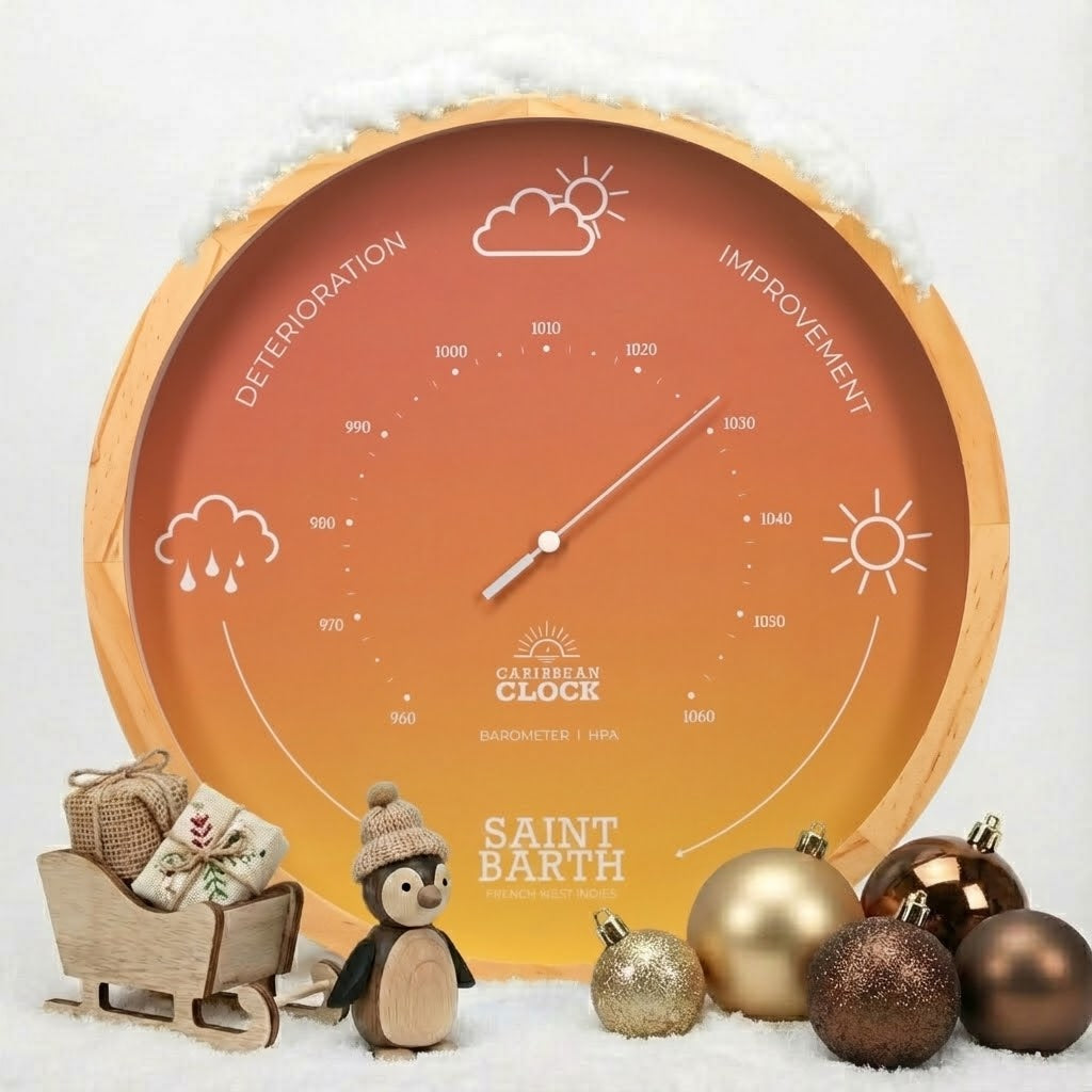 The Sunrise barometer is inspired by the golden light that illuminates the beaches of Saint Barthélemy at sunrise. Handcrafted from natural wood with an anodized aluminum needle, it combines meteorological reliability with refined aesthetics. A decorative and functional instrument, designed to last and enhance even the most demanding interiors.