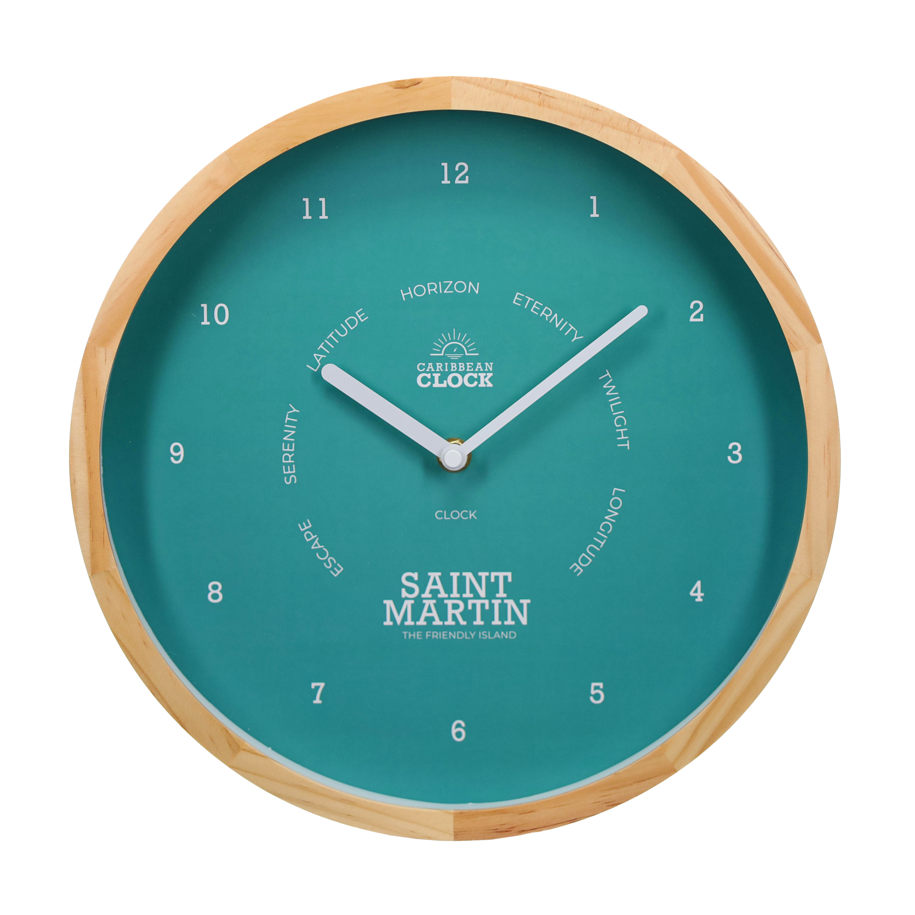 Handcrafted from natural wood with anodized aluminum hands, it combines the precision of time with the gentle vegetation of the island of Saint Martin.